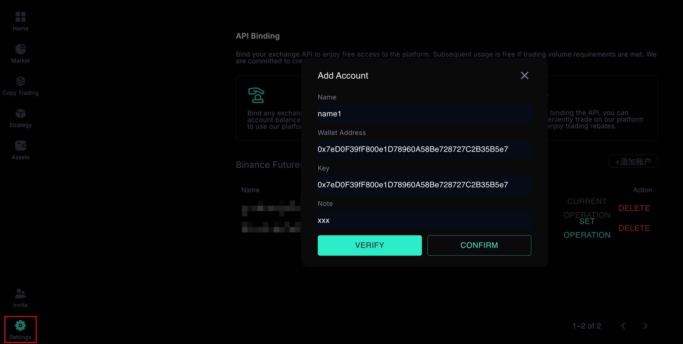 Users can complete wallet binding through either the Settings interface or the Trading interface.