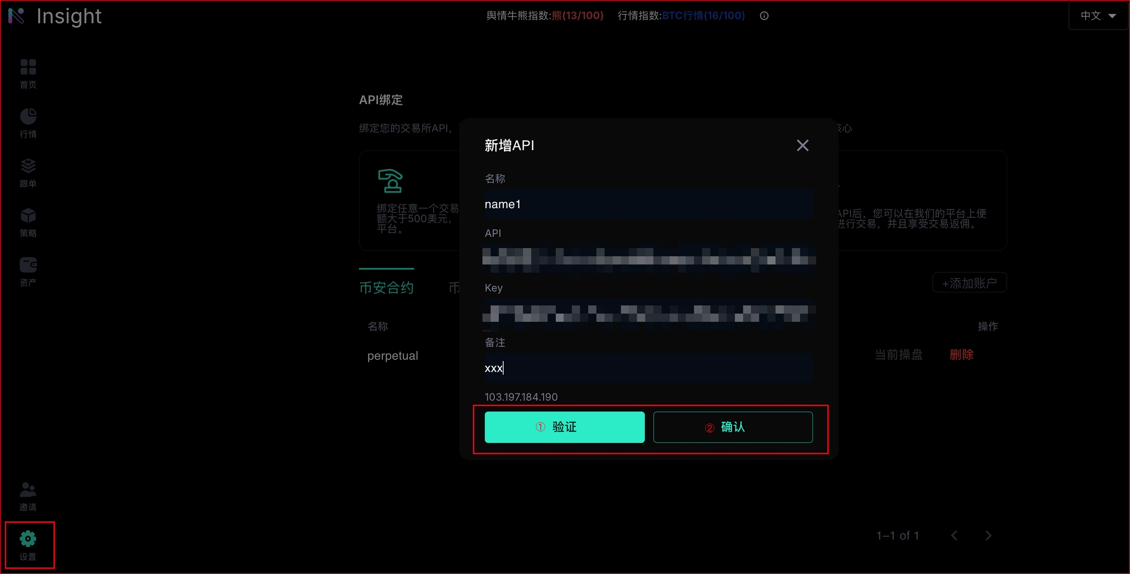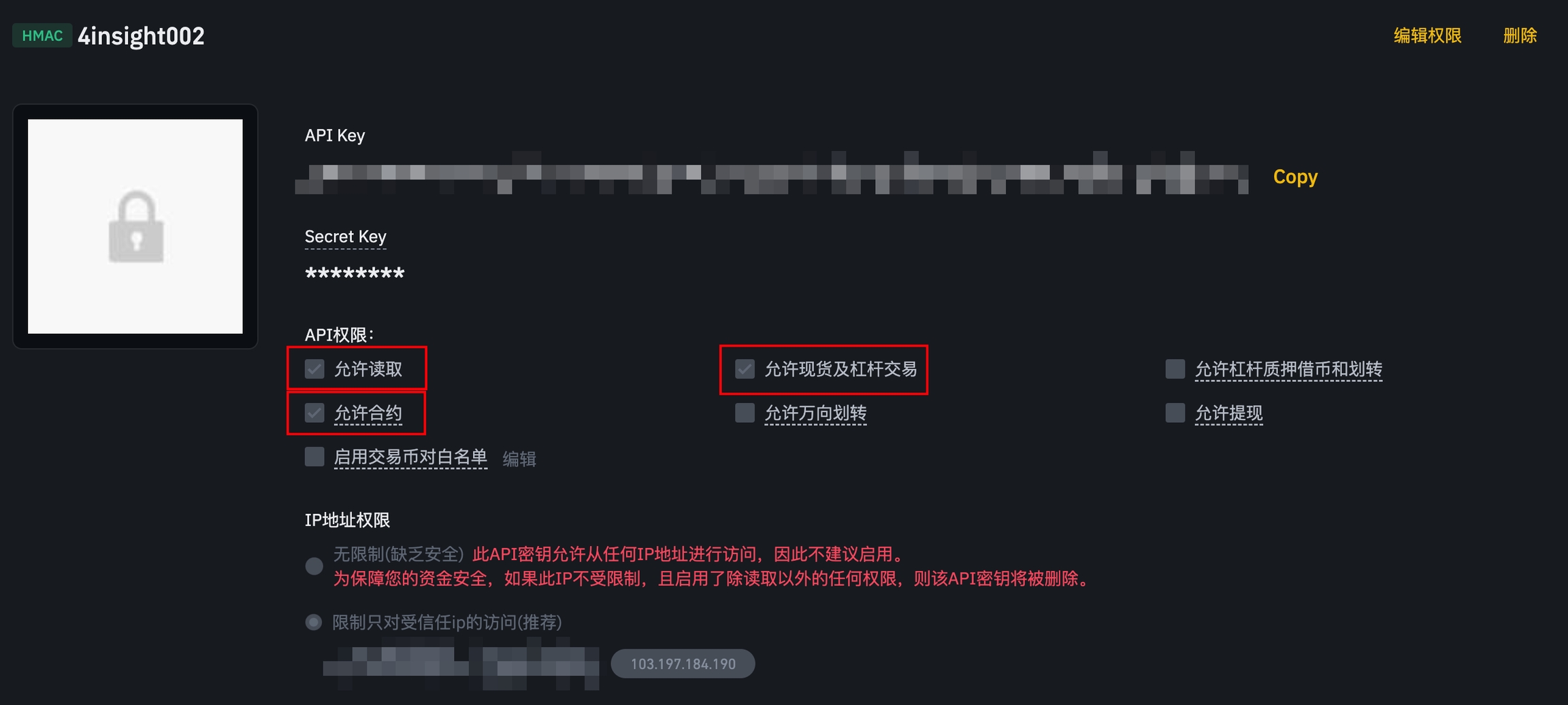 输入币安API和key。注意:币安API务必启动对应的现货/合约交易权限,同时IP白名单务必绑定下方IP地址!