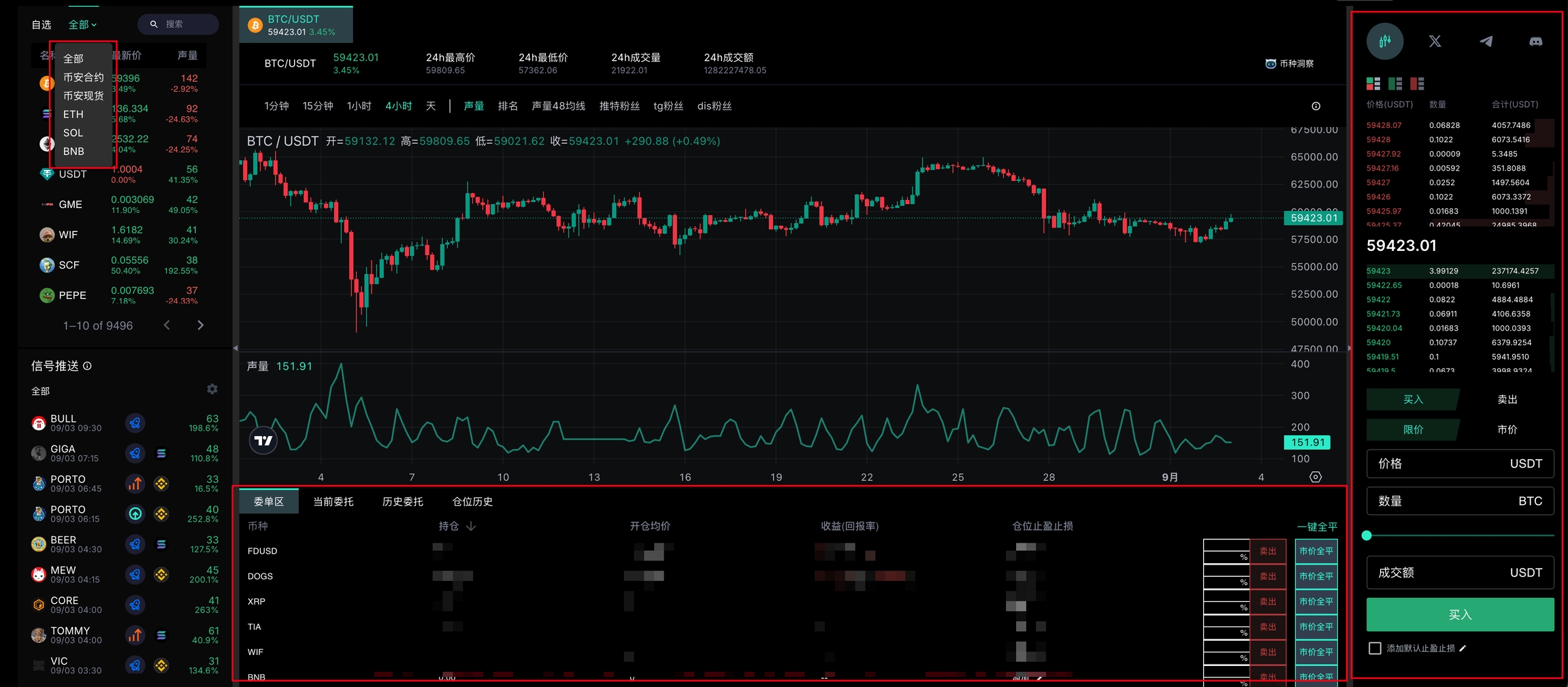 右侧完成币安现货及合约交易。