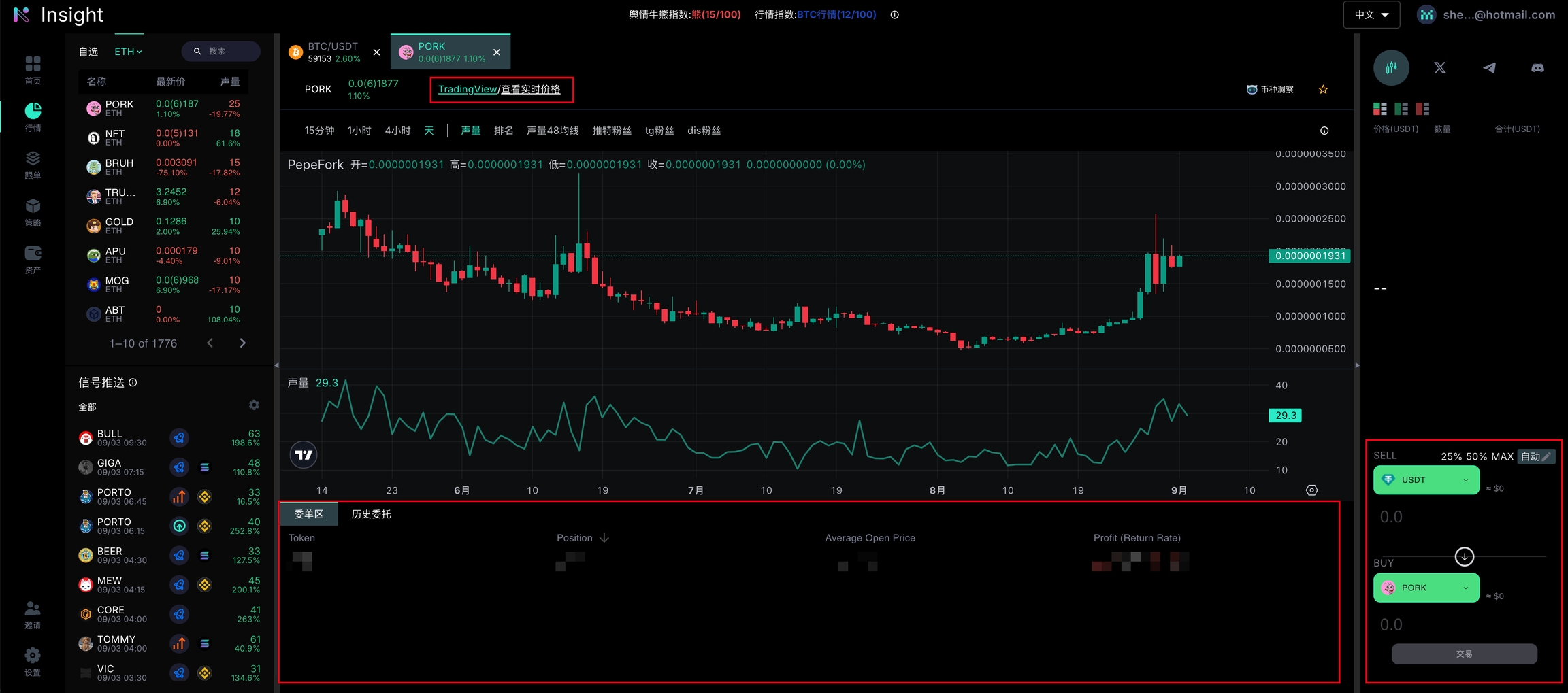 下方可以查看委单区、历史委托和仓位历史。