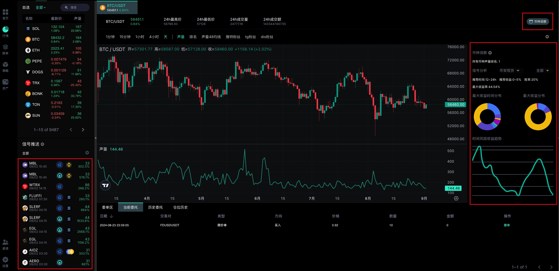 通过右侧“币种洞察”看板,了解当前市场环境下各信号的交易建议。包含: